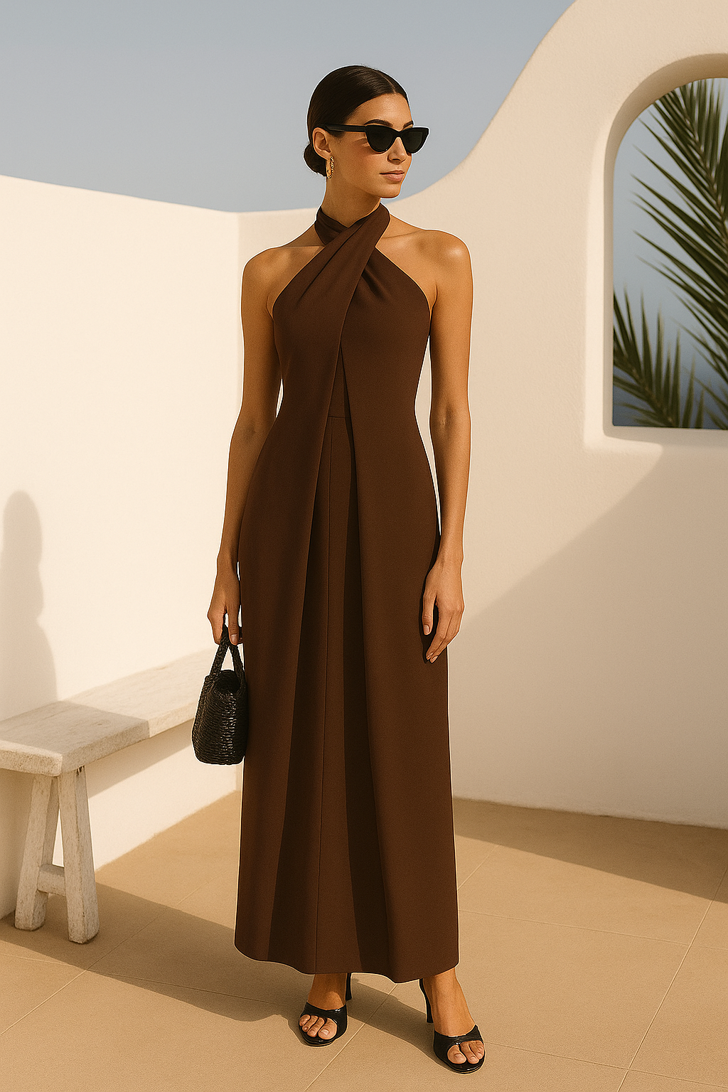 Enterizo celeste coffee. Su escote halter cruzado aporta un aire elegante y femenino, mientras que la espalda descubierta con amarre ancho le da un toque moderno.